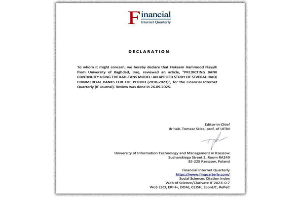 Assistant Professor Dr. Hakim Hamoud Falih, a lecturer in the Department of Accounting Studies at our institute, has been selected as a peer reviewer for a research paper submitted to the Financial Internet Quarterly journal of the University of Information Technology and Management in Rzeszow. The journal is classified in Web of Science/Clarivet with an impact index of 0.7 for 2023.